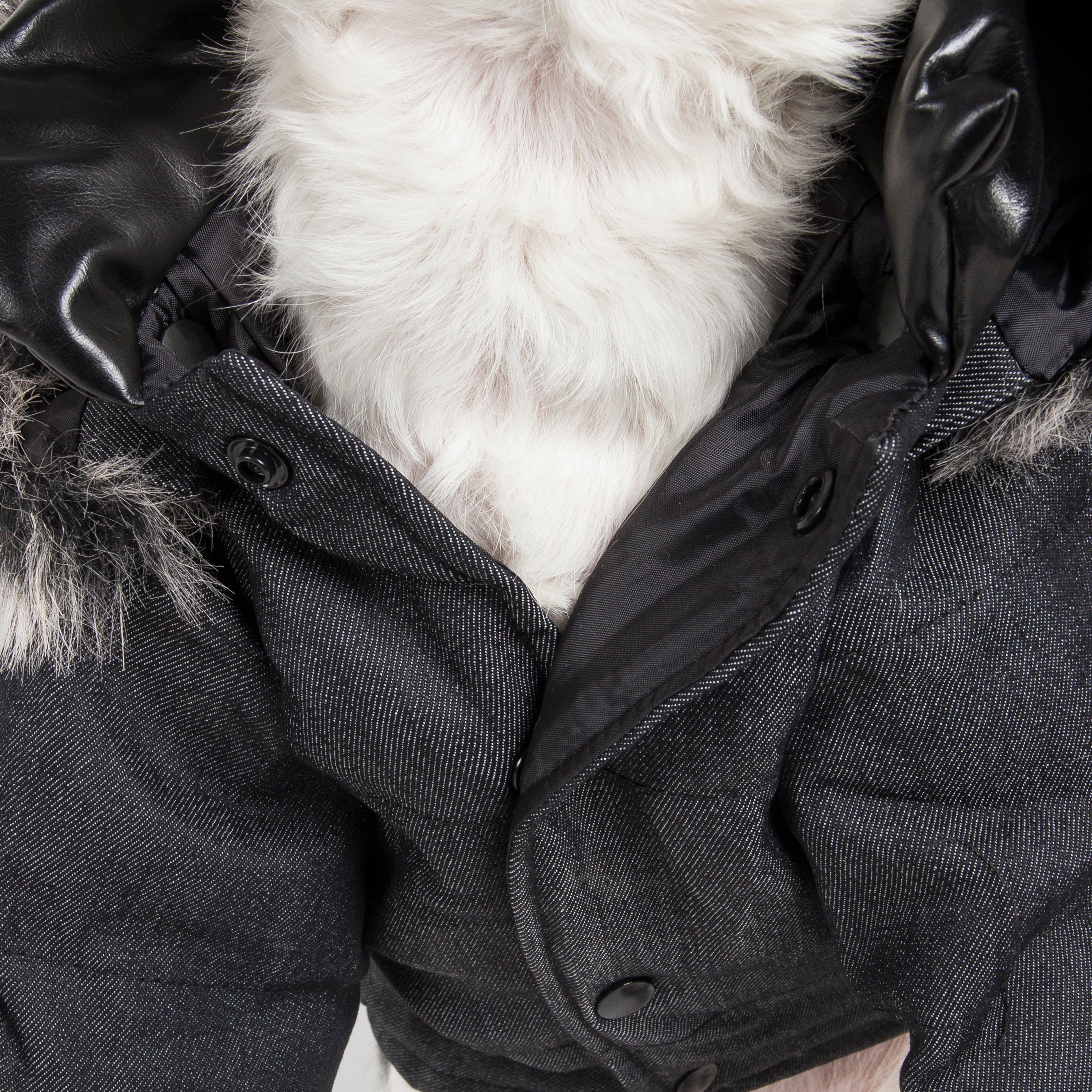 The Pet Life 'Ruff-Choppered' Fashion Dog Coat is composed of denim cotton and pvc fabrics. This pet coat features a back-snap pocket and dual zippered accented pieces along the backside. This dog jacket also features a faux fur hood. Additionally, this pet coat features a snap button closure by the belly for easy on/off access and a leash slit holder behind the neck area. Available in multiple sizes.