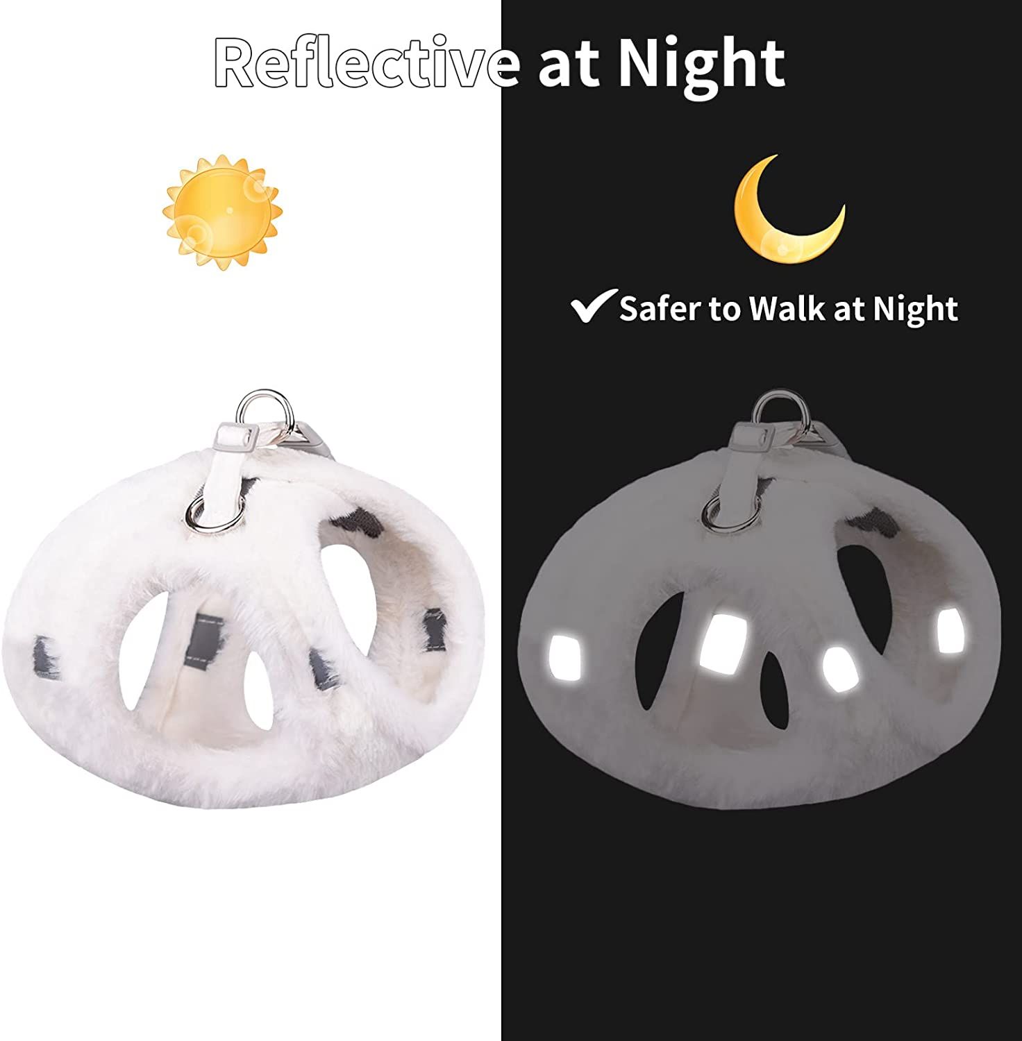 • WARM PLUSH & SAFE - Made with soft imitation rabbit hair; super fluffy; warm and more comfortable; this lightweight pet harness is perfect for walks in autumn and winter. The vest-style design disperses the pressure through shoulders and chest; uniform force; no need to worry about the danger of suffocation or choking.Our hook and loop fastener; buckle and D-rings work together protect your pet in triple security.