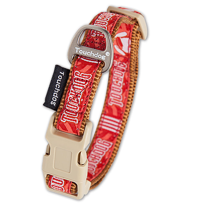 The Touchdog Tough-Stitched Durable Embroidered Collar and Leash features Dual-reinforced stitching for durability and a designer printed pattern with an accented Buckle and a Stainless Steel leash connector.
